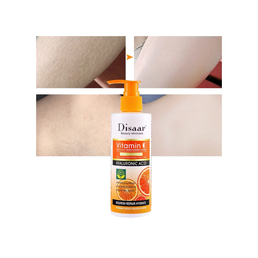 La loción corporal blanqueadora de vitamina C de Disaar es una crema hidratante profunda para el cuerpo y la cara. Contiene colágeno VC VE, reduce la melanina e ilumina la piel.