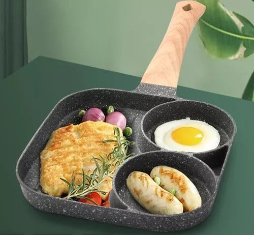 Fabricado con piedra maifan de primera calidad, este sartén garantiza una cocción uniforme y sin adherencias. Olvídate del humo aceitoso y disfruta de alimentos perfectamente cocidos. Además, su diseño con tres compartimentos te permite cocinar diferentes alimentos al mismo tiempo, haciendo de la preparación una tarea rápida y sencilla.