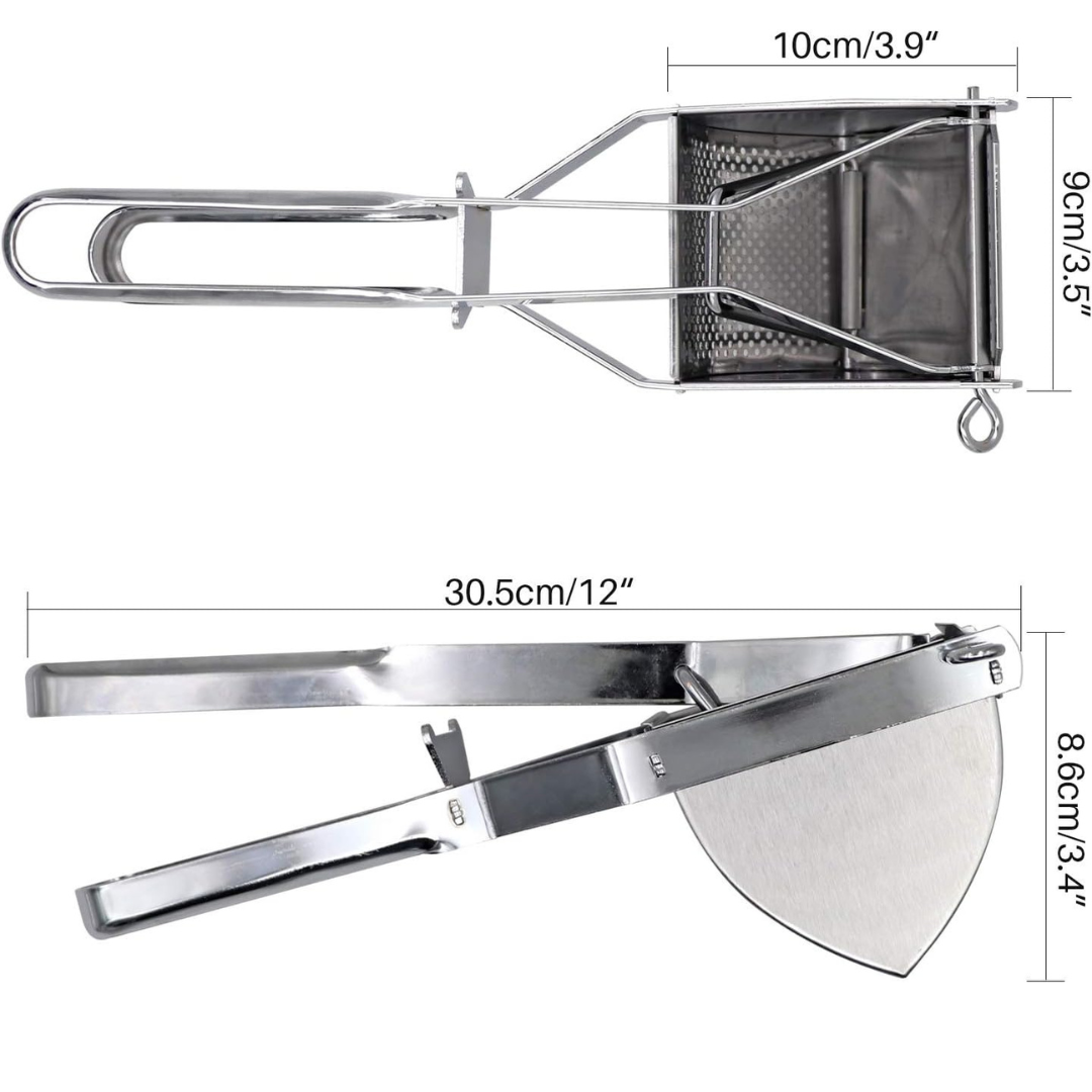- Fácil de Usar: Su diseño ergonómico con asas largas permite un agarre cómodo y un esfuerzo mínimo. Simplemente coloca las patatas cocidas, solo presiona la palanca.
